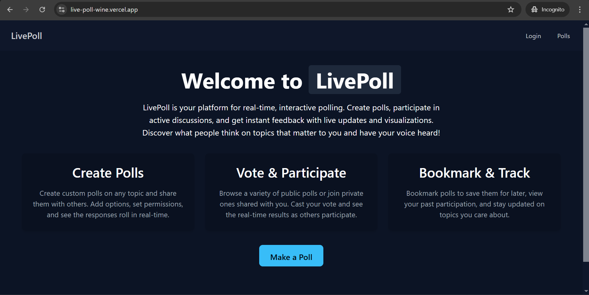 LivePoll is an interactive web application designed to simplify the process of creating, participating in, and managing polls. It combines user-friendly features with real-time updates to deliver a seamless polling experience📊.